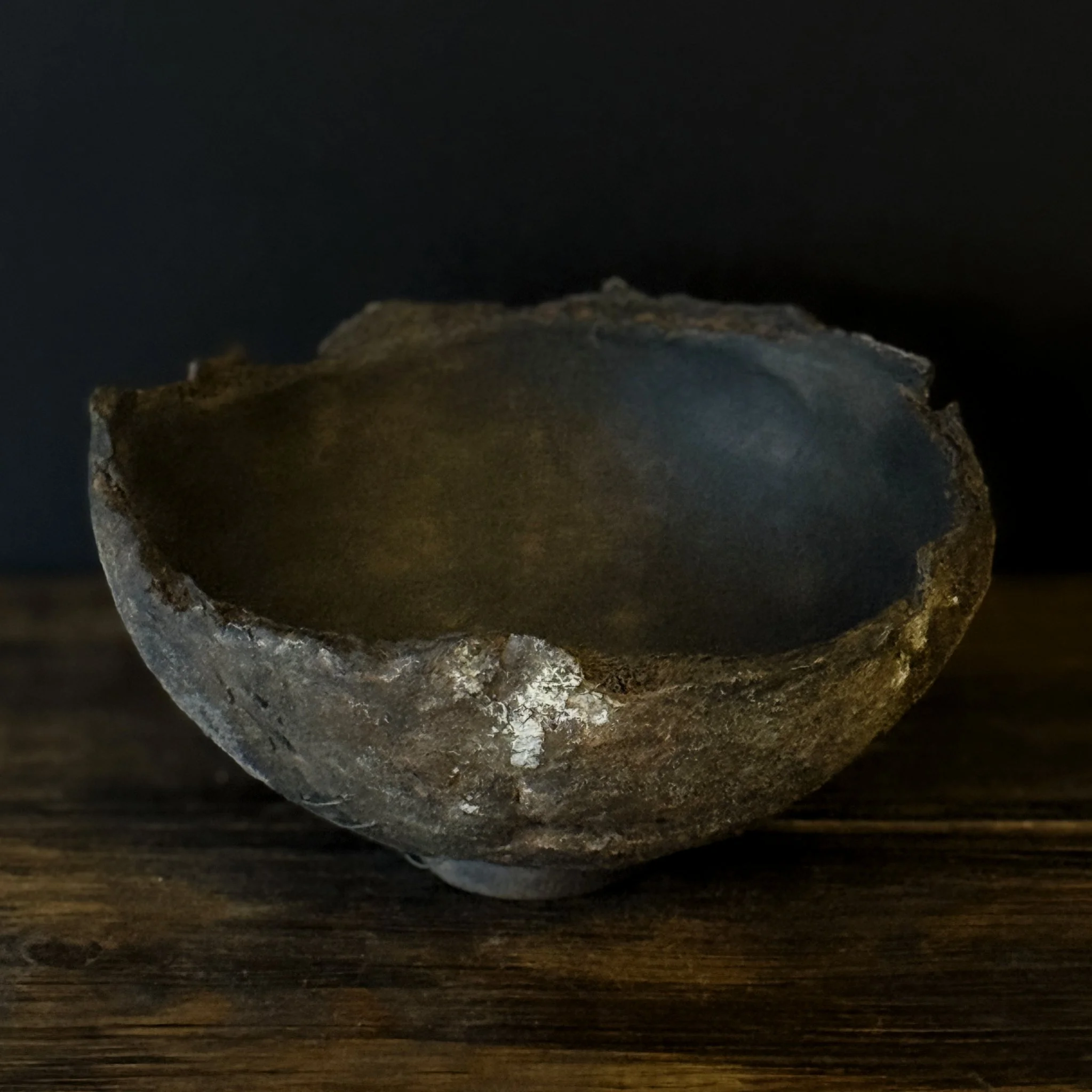 Formed from New Zealand clay, this bowl’s layered, textured surfaces bear a burnt appearance. Metal staples hold fragments together referencing Ju Ci, the ancient Chinese method to repair ceramics. A darkened interior reveals subtle textures, evoking memory’s traces and the raw, uneasy emotions of displacement, loss, and identity’s lasting imprint.